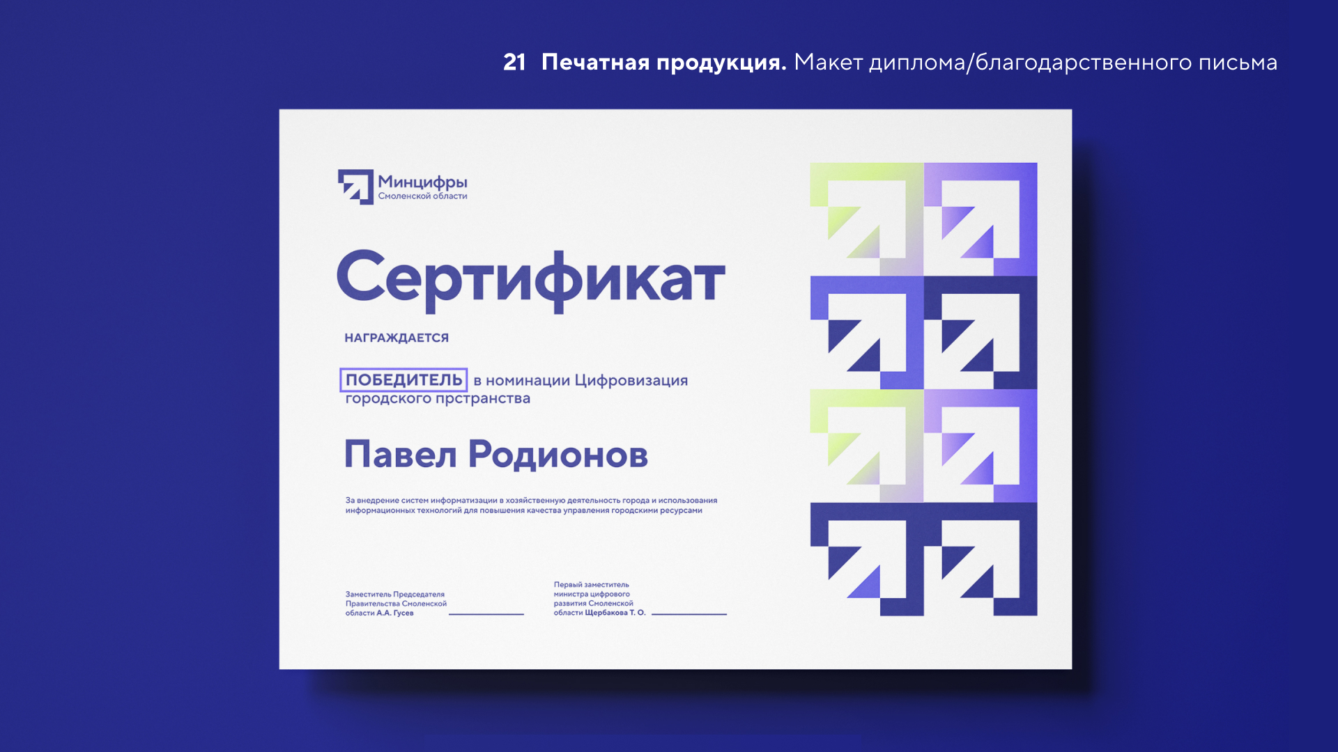 Теперь у Минцифры Смоленской области есть образ, который соответствует её миссии и духу времени. Современный, технологичный, уверенный - он формирует доверие и помогает ведомству говорить с жителями и партнёрами на одном языке.