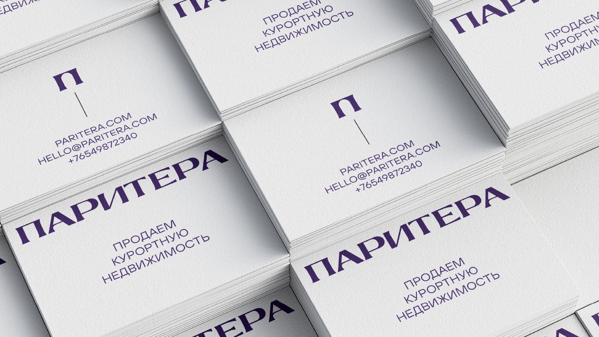 В сочетании с фирменной палитрой глубоких фиолетовых оттенков знак приобретает дополнительное измерение. Плотный, почти осязаемый цвет Violet C заливает обе вертикали, придавая им вес и непоколебимость, а более светлый лавандовый тон мягко высвечивает горизонталь — намёк на свет, инновацию и прозрачность, которые «Паритера» приносит в рынок. Белое пространство вокруг знака работает как воздух равенства и ясности, не позволяя образу стать тяжеловесным.