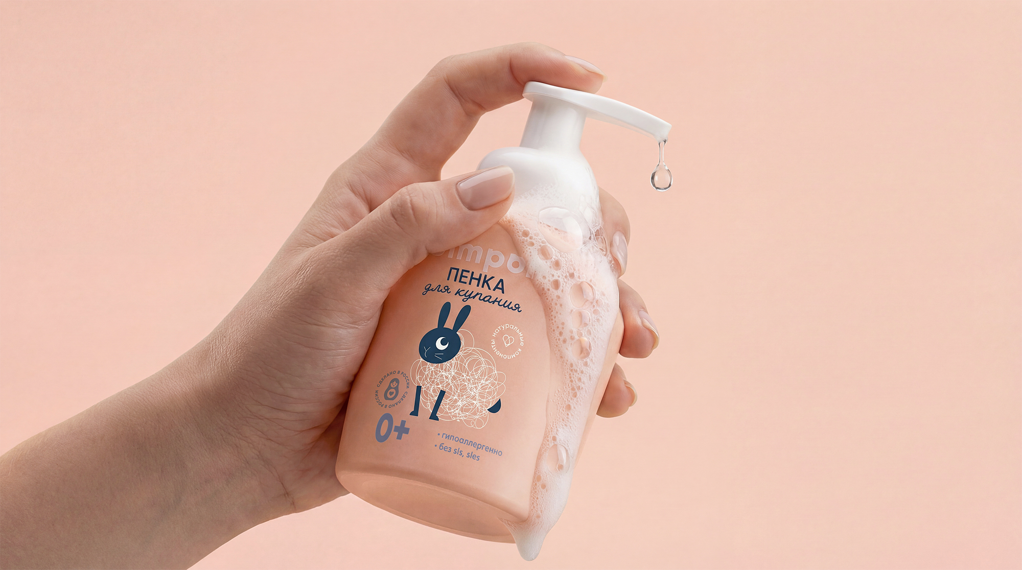 Упаковка говорит с потребителем на языке детства. Лёгкие линии, словно пузырьки пены, складываются в милых зверят. Это тот самый момент в ванной, когда вы вместе улыбаетесь, узнавая в облаке пены очертания сказочного зверя. Это важно не только к ребёнку, но и внутреннему ребёнку в родителе, пробуждая ностальгию и настраивая на игровой, нежный лад.