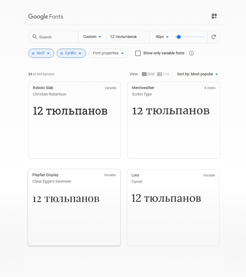 Для вымышленного магазина цветов “12 тюльпанов” наш дизайнер выбрал бы антикву “Playfair”: она достаточно декоративная, но при этом современная и хорошо смотрится на дисплеях.