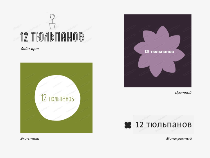 Наш дизайнер остановился на бесплатном генераторе логотипов turbologo.ru и сделал несколько максимально отличающихся логотипов вымышленного цветочного магазина. Такая сетка поможет помочь создать несколько простых референсов, от которых можно оттолкнуться в дальнейшем.